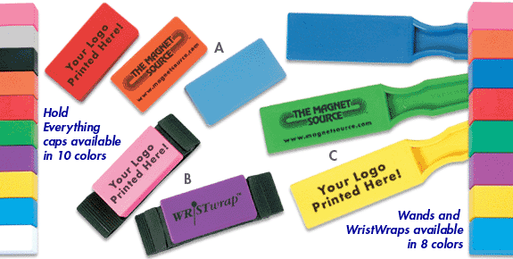 A. Hold Everything Magnets These heavy duty plastic caps feature a powerful ceramic magnet mounted inside. Useful for holding memos, calendars, letters and more to metal surfaces. In addition to their magnetic strength, these caps are powerful and versatile enough to capture your customers' attention! Have your company or organization name printed directly on the cap. Choose from white, blue, yellow, purple, green, red, orange, black, gray or pink colored cap. B. WRISTwrapT Wearable Pin Holder A powerful, permanent magnet enclosed in a colorful wearable magnetic pin holder. Add your logo, website or name for a lasting impression! C. Colorful Magnetic Wands A powerful, permanent magnet enclosed in the end of a colorful polystyrene wand. Can easily be screen printed with your name, logo, address, phone number and website. For both the WRISTwrapT and magnetic wands, choose from light blue, yellow, purple, green, red, blue, orange or pink.