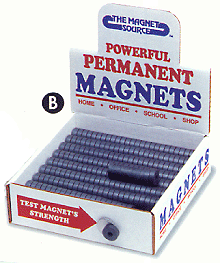 Display contains 500 magnets, consisting of 300 CD10 ( 0.701"Dia x 0.197" Th) disc magnets and 200 CR75 ( 0.75" Outdia x 0.25 India x 0.25" Th) ring magnets